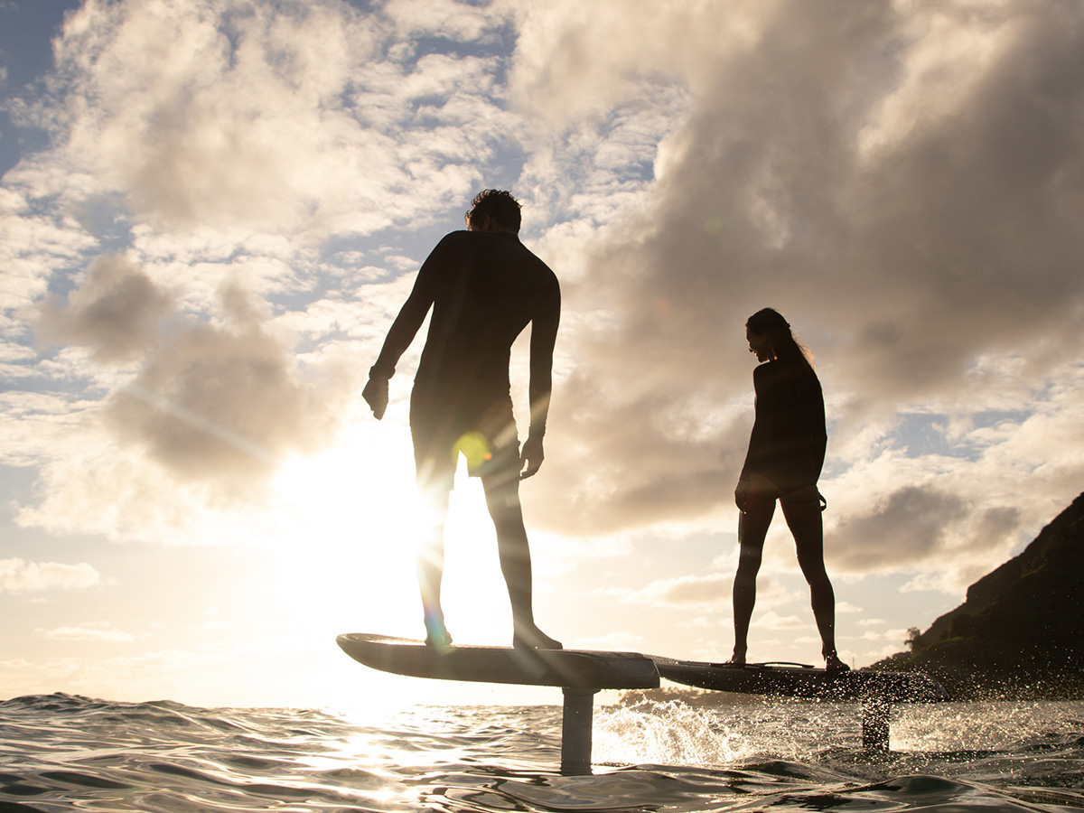 eFoil to elektryczna deska surfingowa z hydroskrzydłem (foil), która unosi się nad wodą już przy prędkości 15–25 km/h. Dzięki cichej pracy silnika i intuicyjnemu sterowaniu pilotem, możesz poczuć się jak na poduszce powietrznej – zupełnie niezależnie od warunków pogodowych.